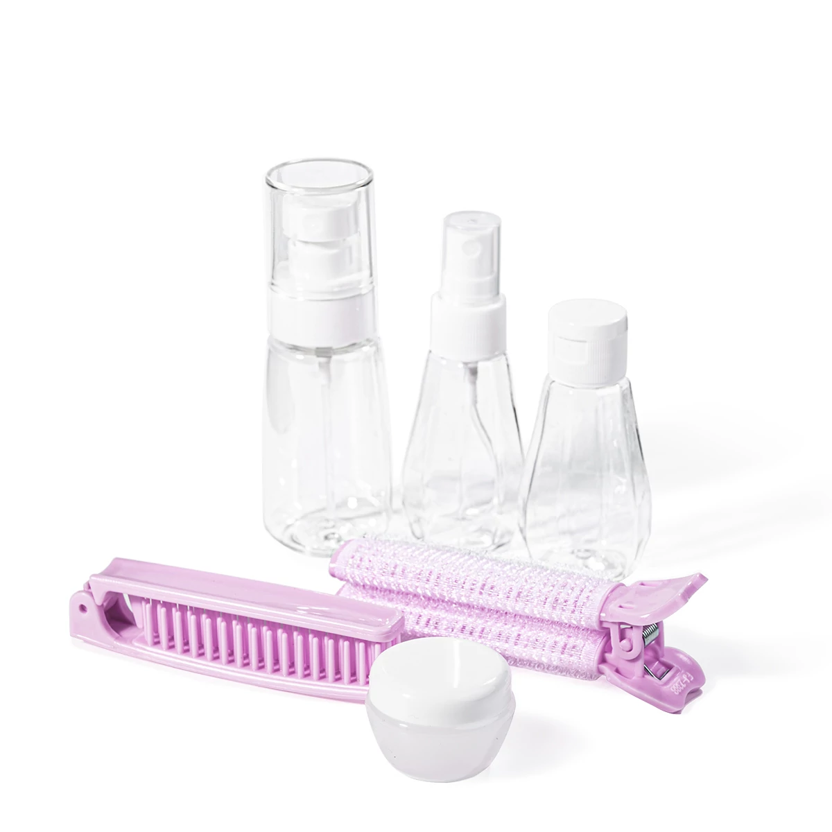 Ez az utazó kozmetikai szett alapvető folyadékok és krémek szállítására készült. Tartalmaz pumpás és szórófejes flakonokat, valamint kisebb tégelyeket, fésűt és hajcsavarót egy átlátszó cipzáras tasakban. Méretéből adódóan repülőn is használható. Funkcionális megoldás utazásokhoz.