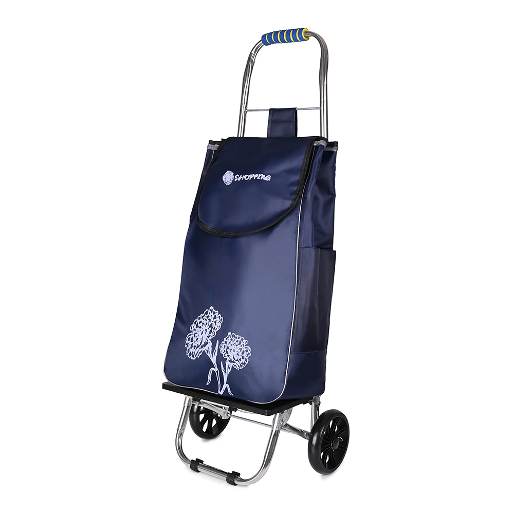 Ez a bevásárlókocsi praktikus társ a mindennapi vásárlásokhoz, amely megkönnyíti a nehéz szatyrok cipelését. Alumínium váza tartós és stabil, a könnyen gördülő kerekek pedig kényelmes használatot biztosítanak egyenetlen terepen is. A táska nagy kapacitással rendelkezik, így bőven elfér benne a bevásárlás teljes tartalma. A felső rész zsinórral összehúzható és fedéllel zárható, így a benne lévő dolgok biztonságban vannak. A hátoldalán egy cipzáras zseb található, amely ideális a kisebb értékek, kulcs vagy pénztárca elkülönített tárolására. Az ergonomikus, szivacsos markolat kényelmessé teszi a tolást, még hosszabb utak során is. Praktikus és könnyen kezelhető választás mindazoknak, akik szeretnék kényelmesebbé tenni a bevásárlást.